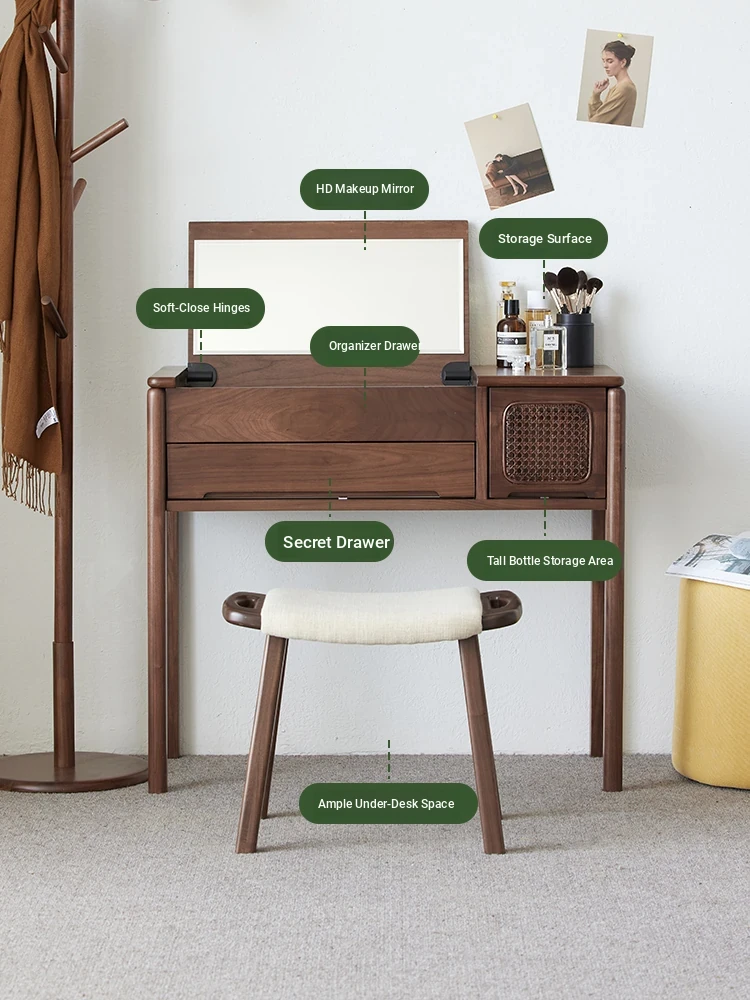 "Stylish Solid Wood Dressing Table & Desk Combo - Compact Vanity for Small Bedrooms, Crafted from North American Black Walnut - Perfect for Modern Spaces"