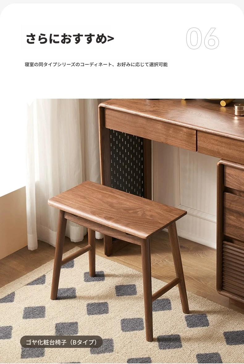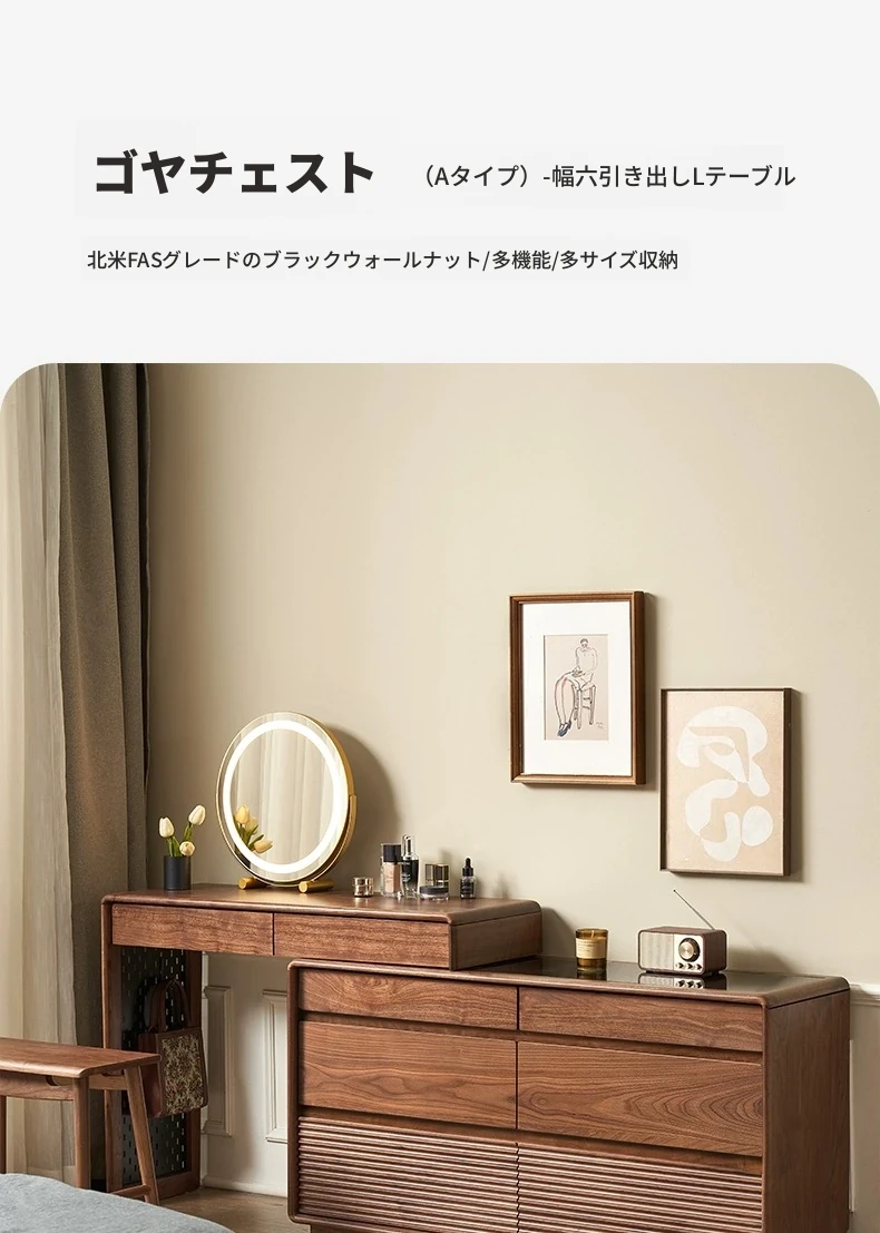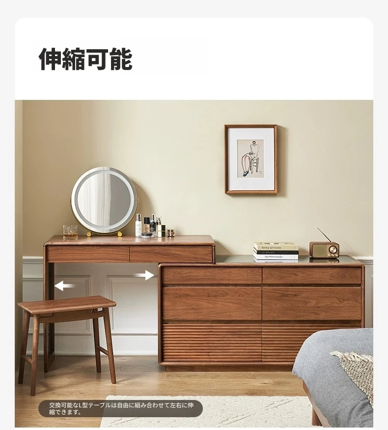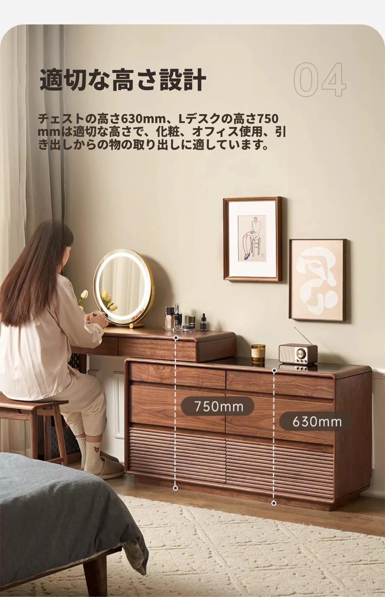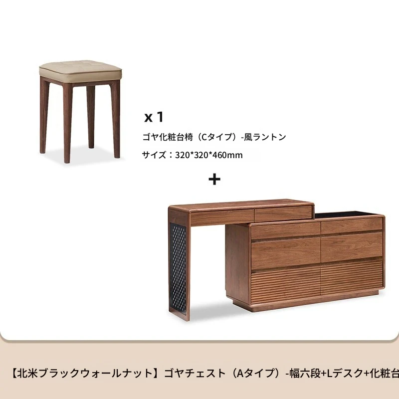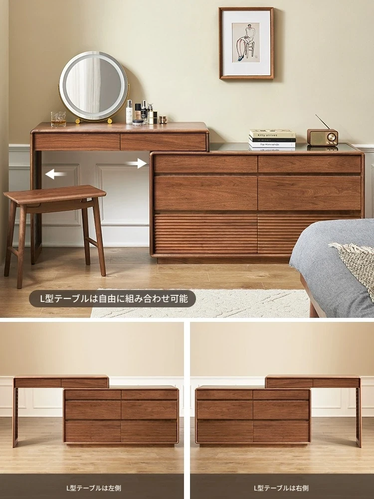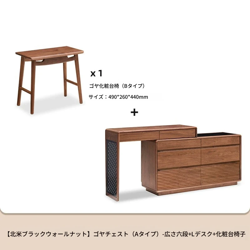 北米ブラックウォールナット 1.2メートル幅の六段チェスト + 0.99メートルLデスク + ドレッサースツール(M1134)