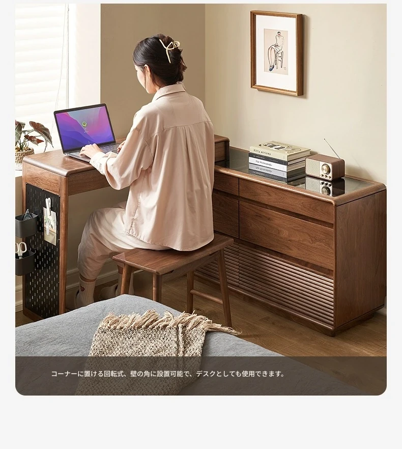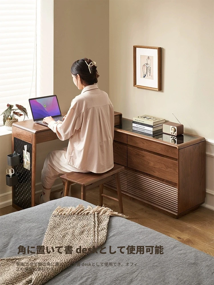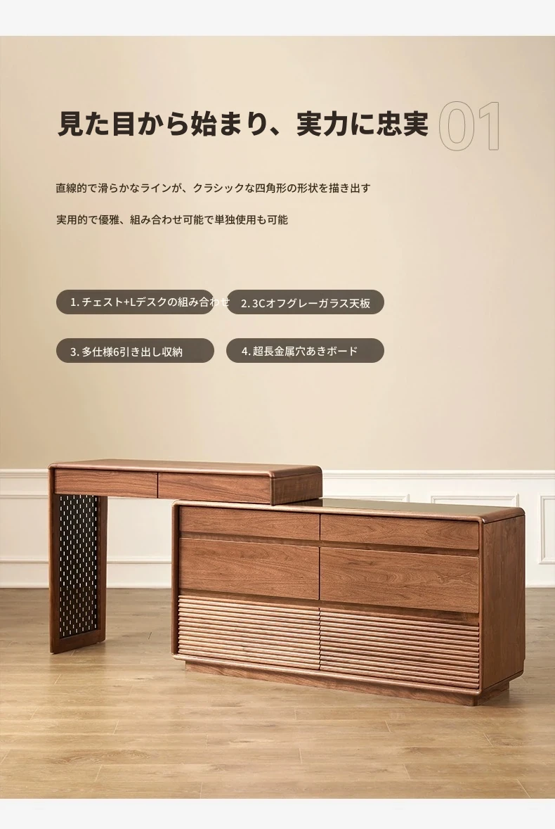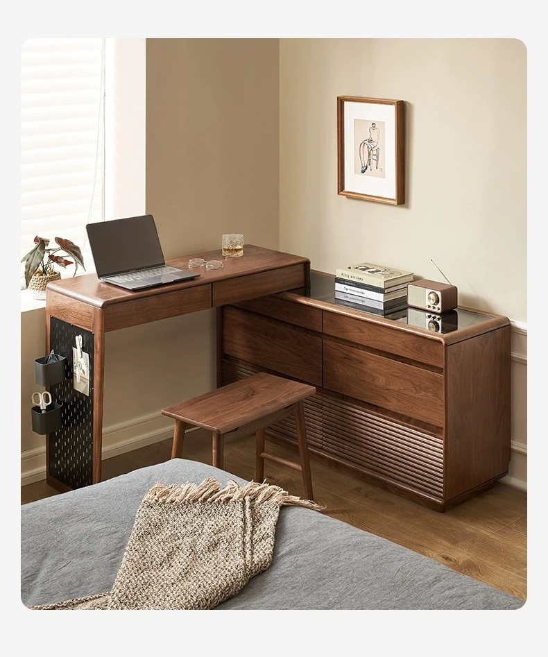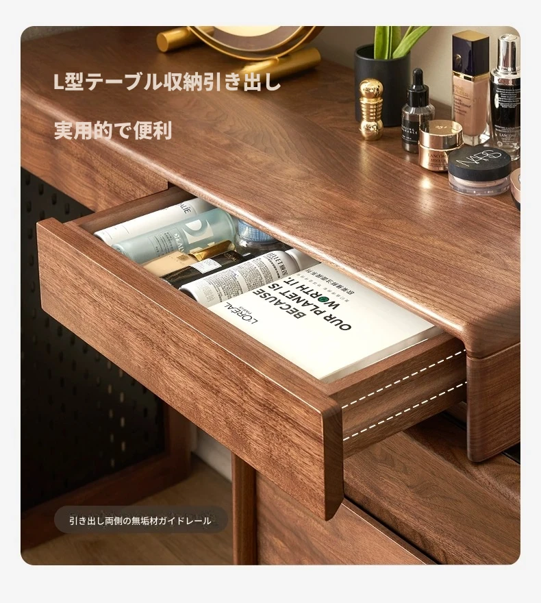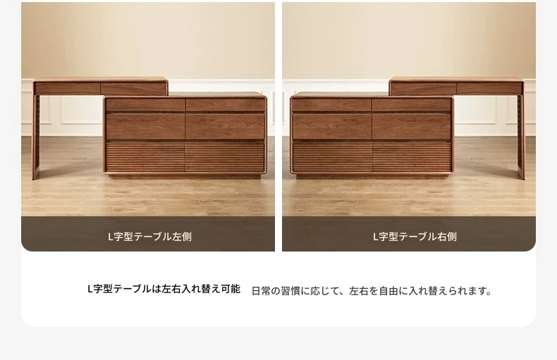 北米産ブラックウォールナット1.2メートル幅の六引き出しキャビネット + 0.99メートルL字型デスク + 化粧台椅子(M1133)