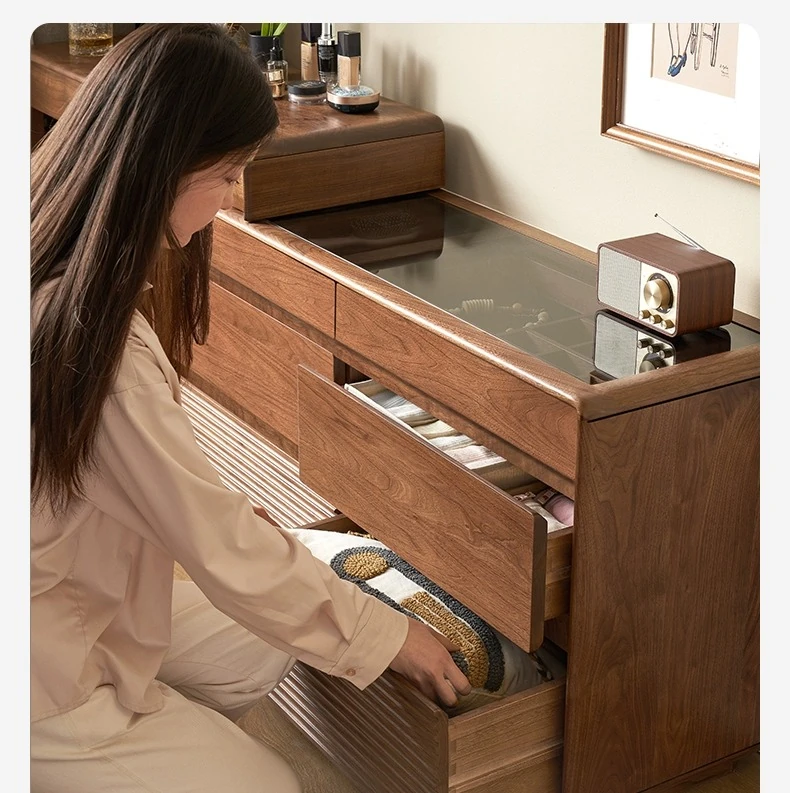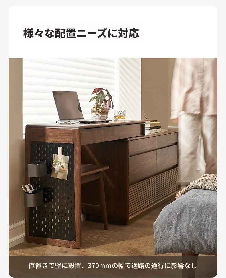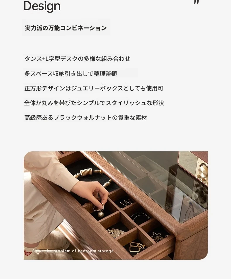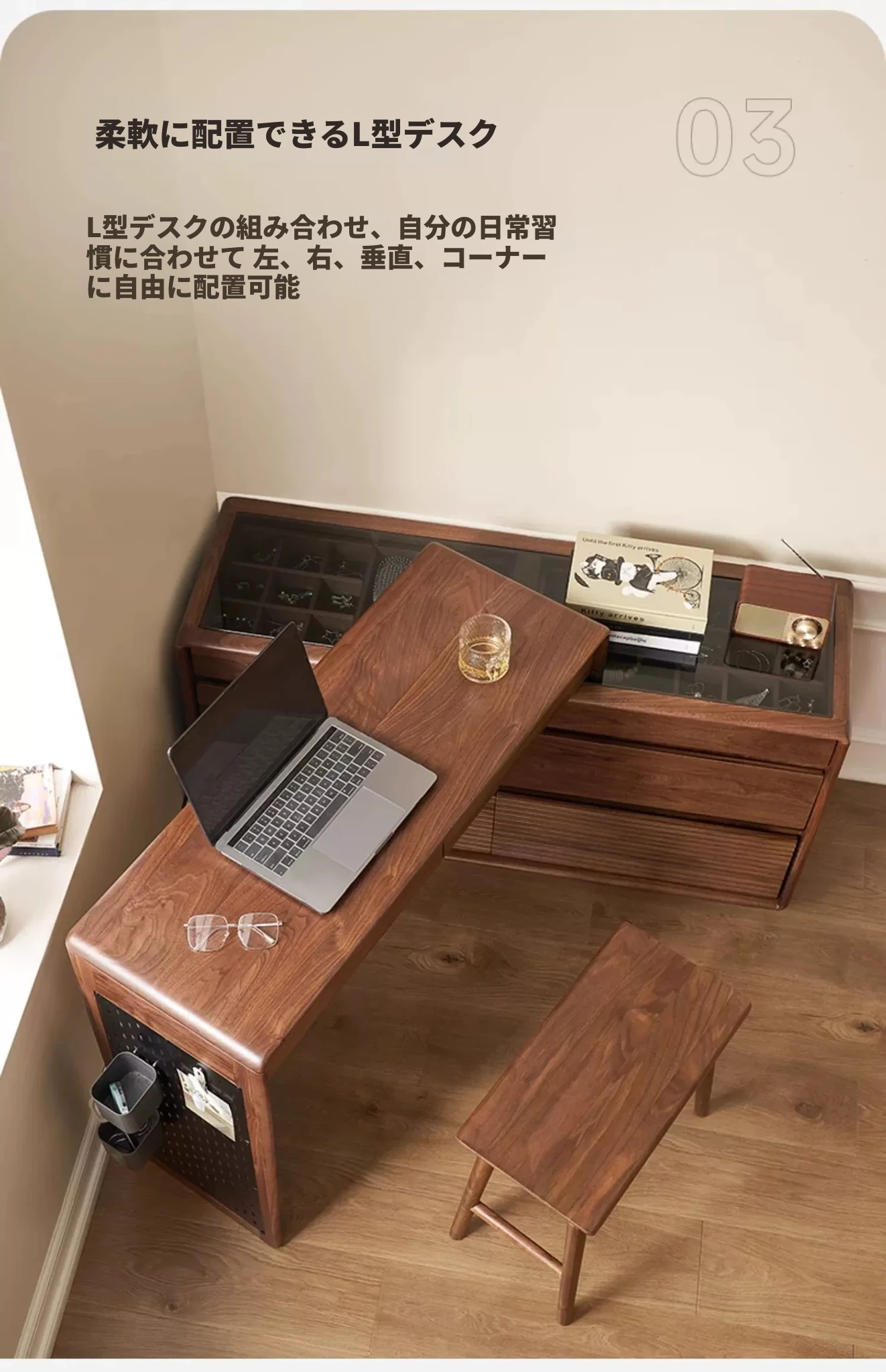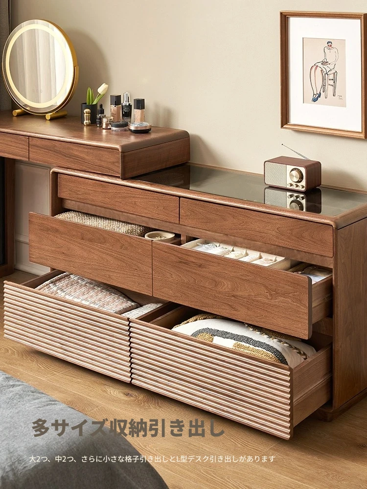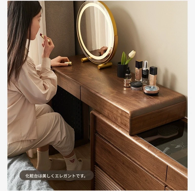 北米産ブラックウォールナット1.2メートル幅の六引き出しキャビネット + 0.99メートルL字型デスク + 化粧台椅子(M1133)