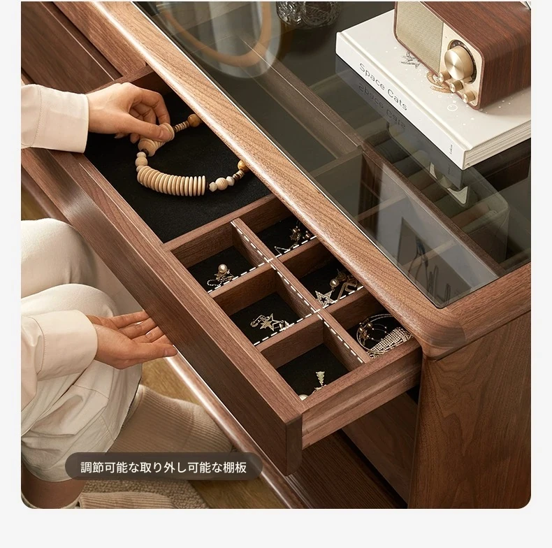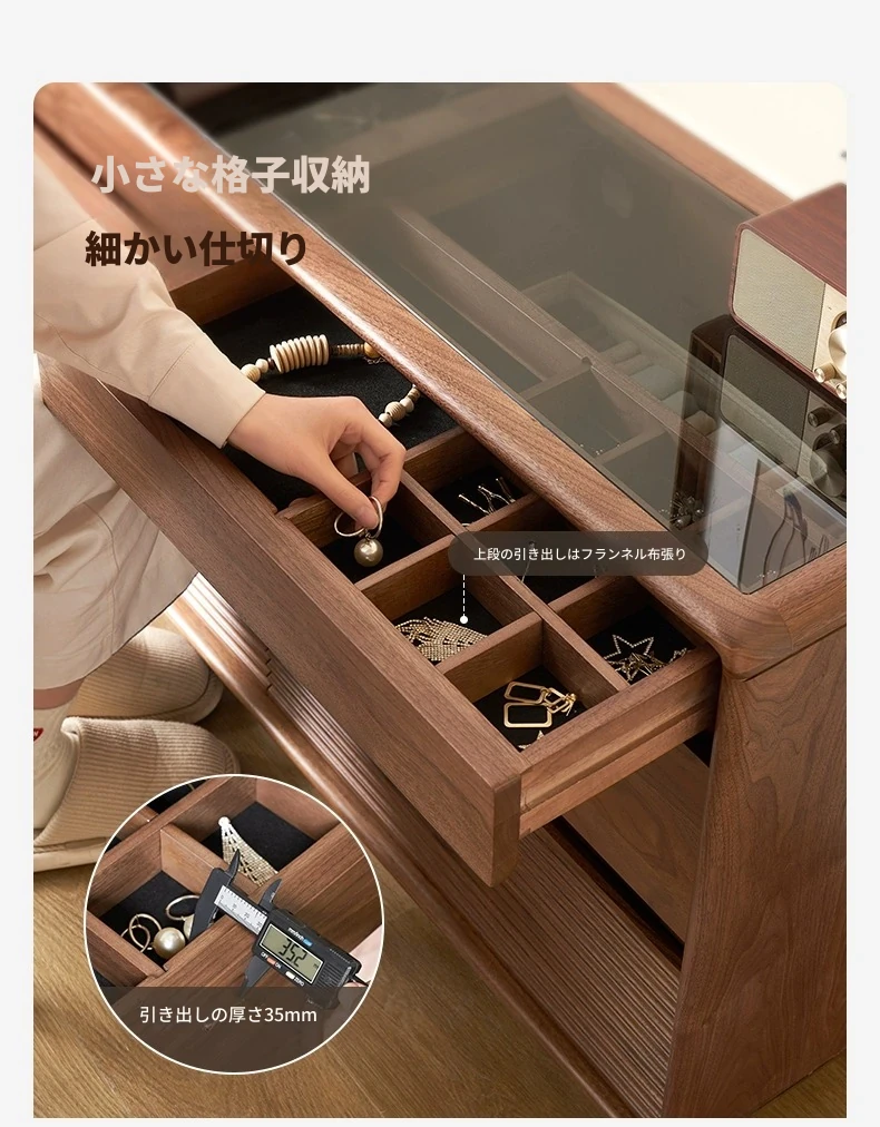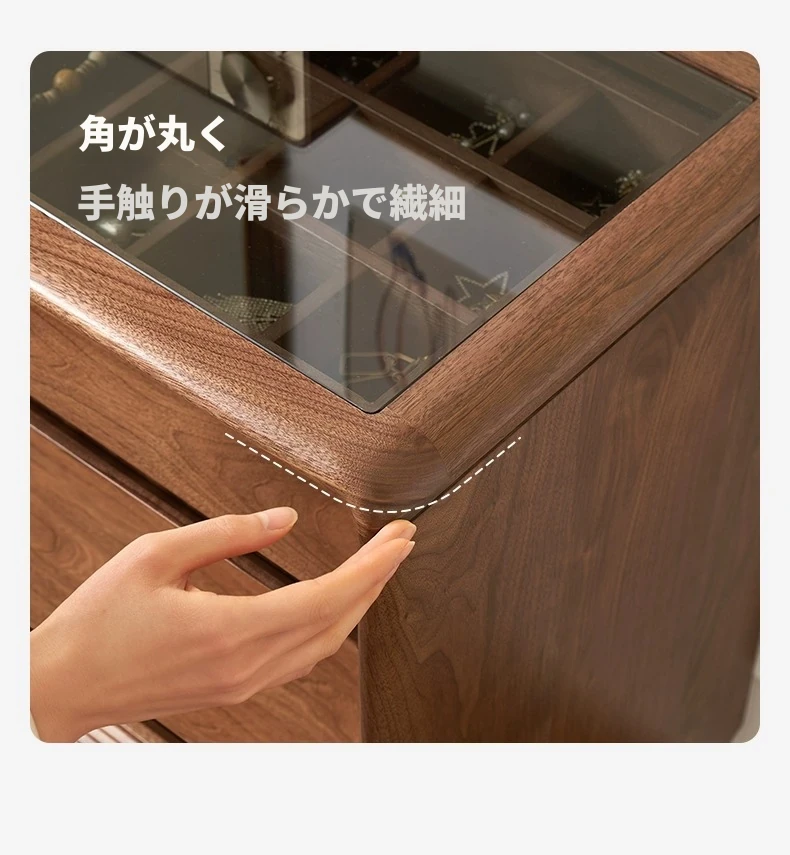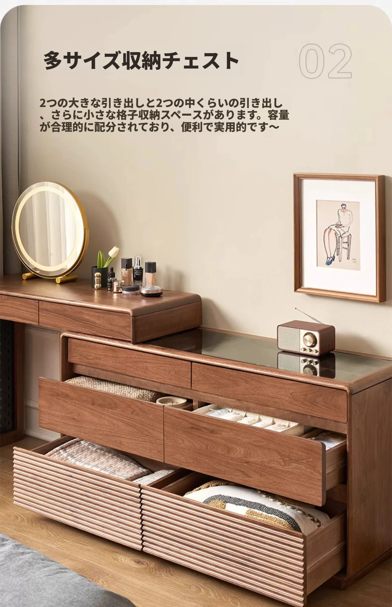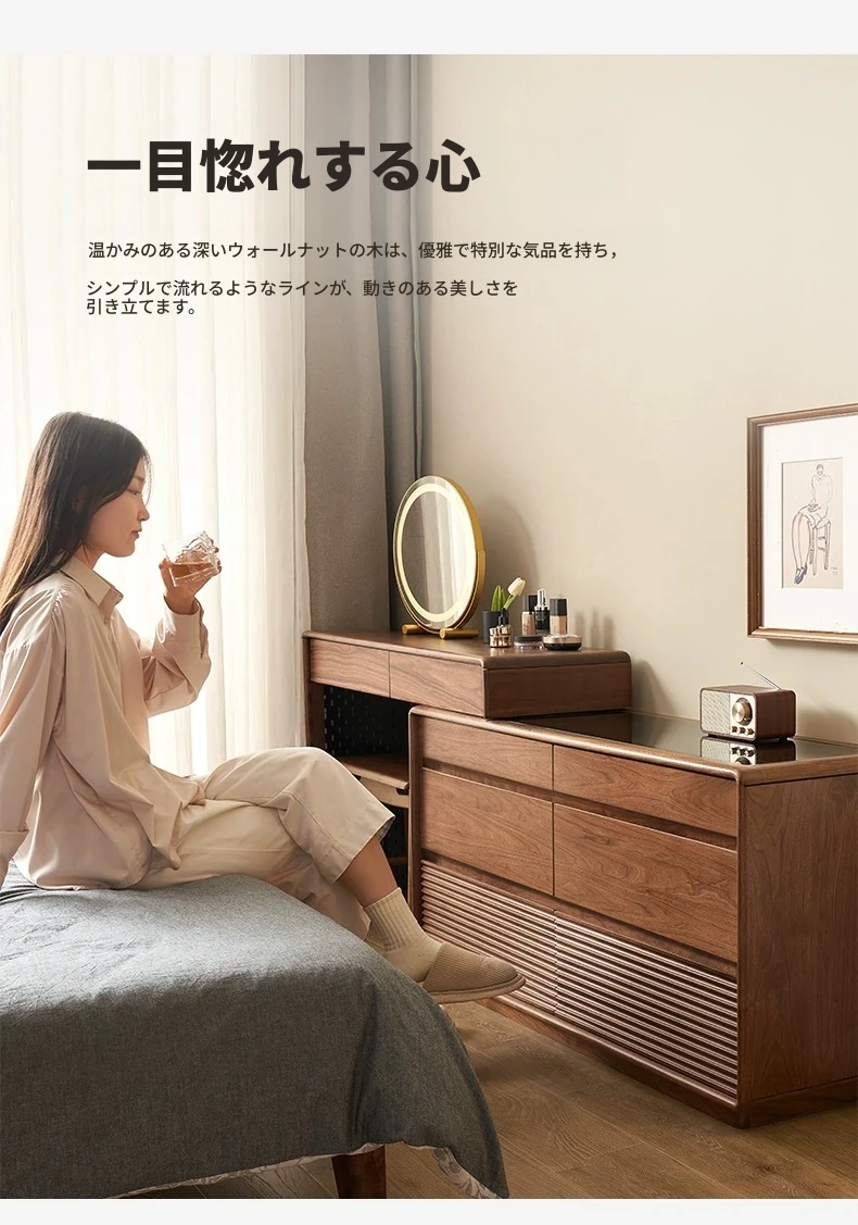 オーガニックな無垢材使用!北米産ブラックウォールナットのドレッサー兼チェスト。美しいデザインの収納ベッドサイドキャビネットとコーナーテーブルを一体化。あなたの部屋をスタイリッシュに演出します!