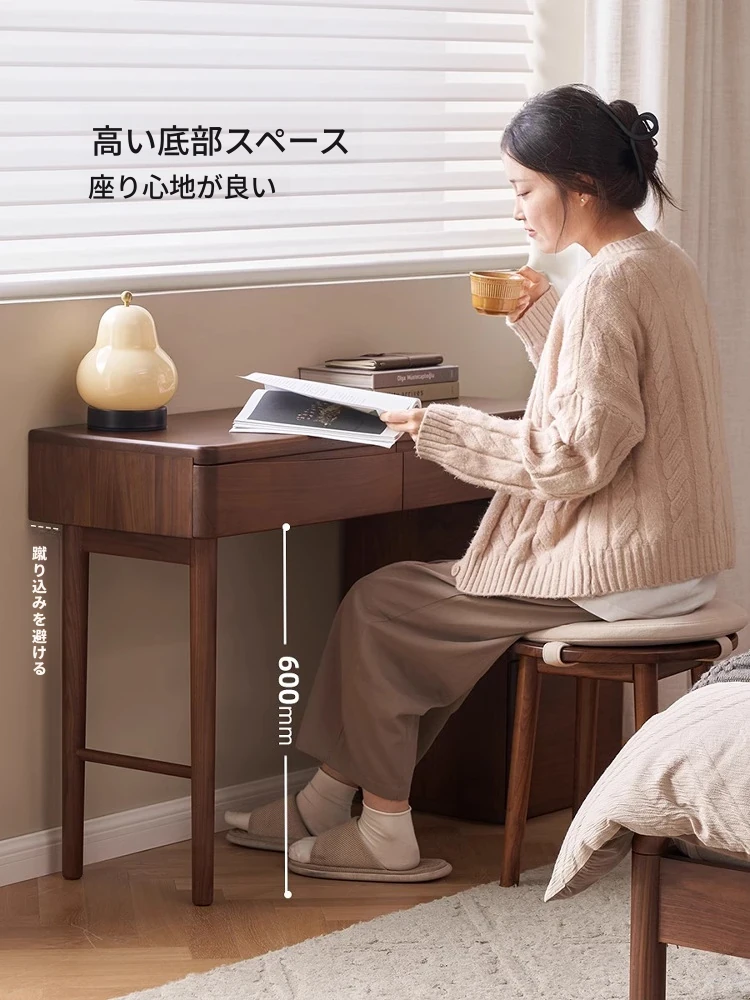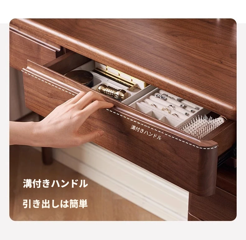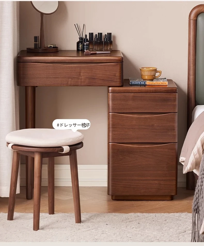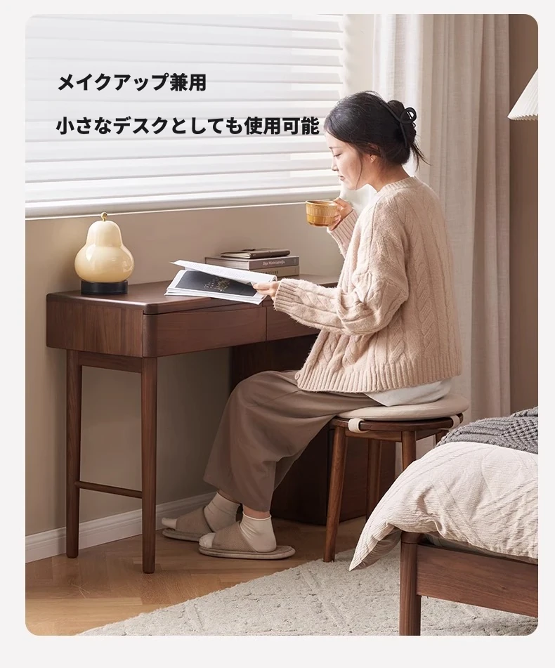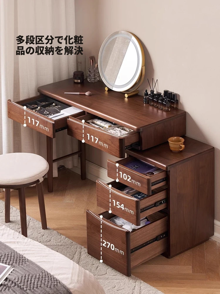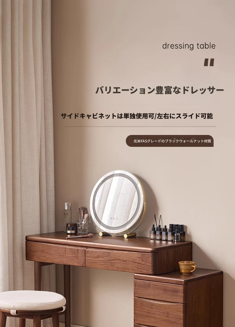 オーセンティックな無垢材のドレッサー - 北美産ブラックウォルナット使用、軽やかなラグジュアリー感!女性のためのメイクアップ&収納一体型テーブルで、あなたの寝室をスタイリッシュに演出します。