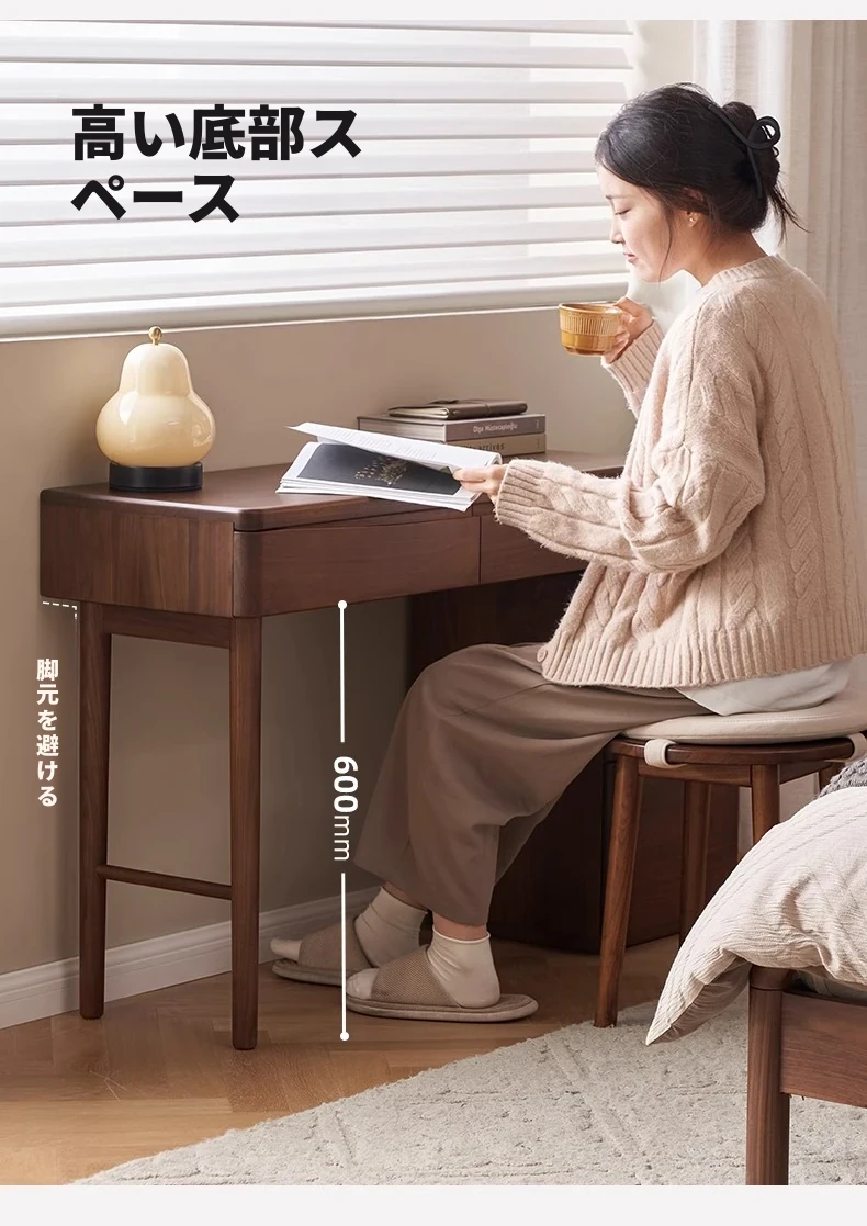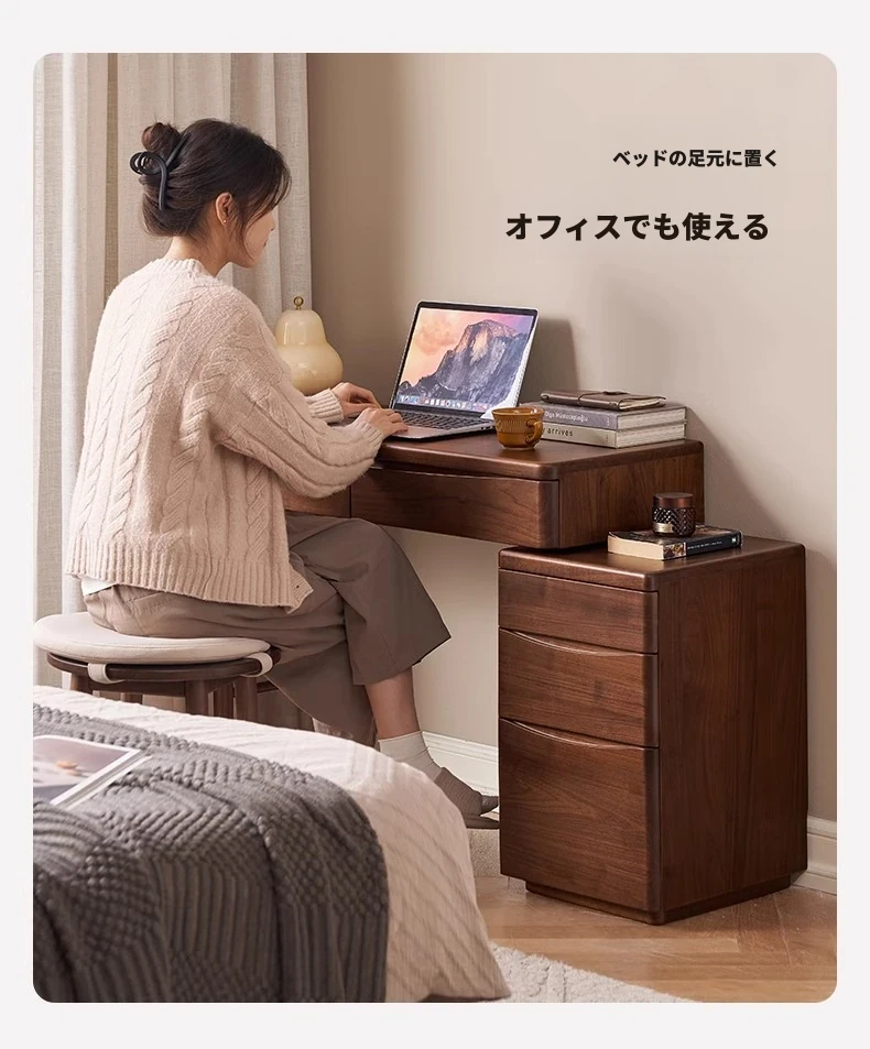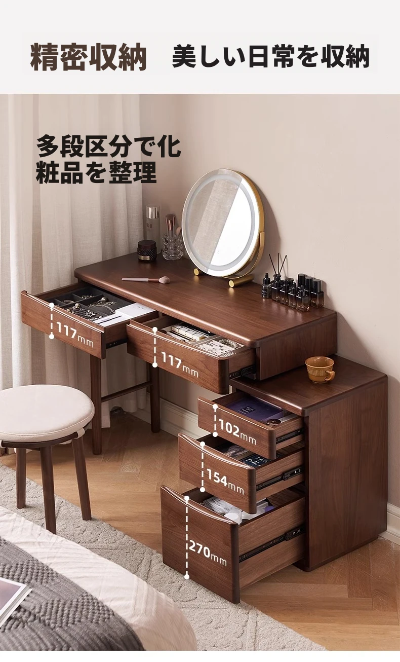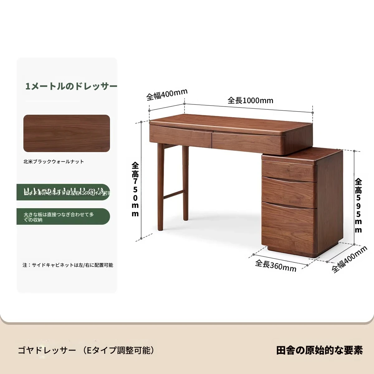 オーセンティックな無垢材のドレッサー - 北美産ブラックウォルナット使用、軽やかなラグジュアリー感!女性のためのメイクアップ&収納一体型テーブルで、あなたの寝室をスタイリッシュに演出します。