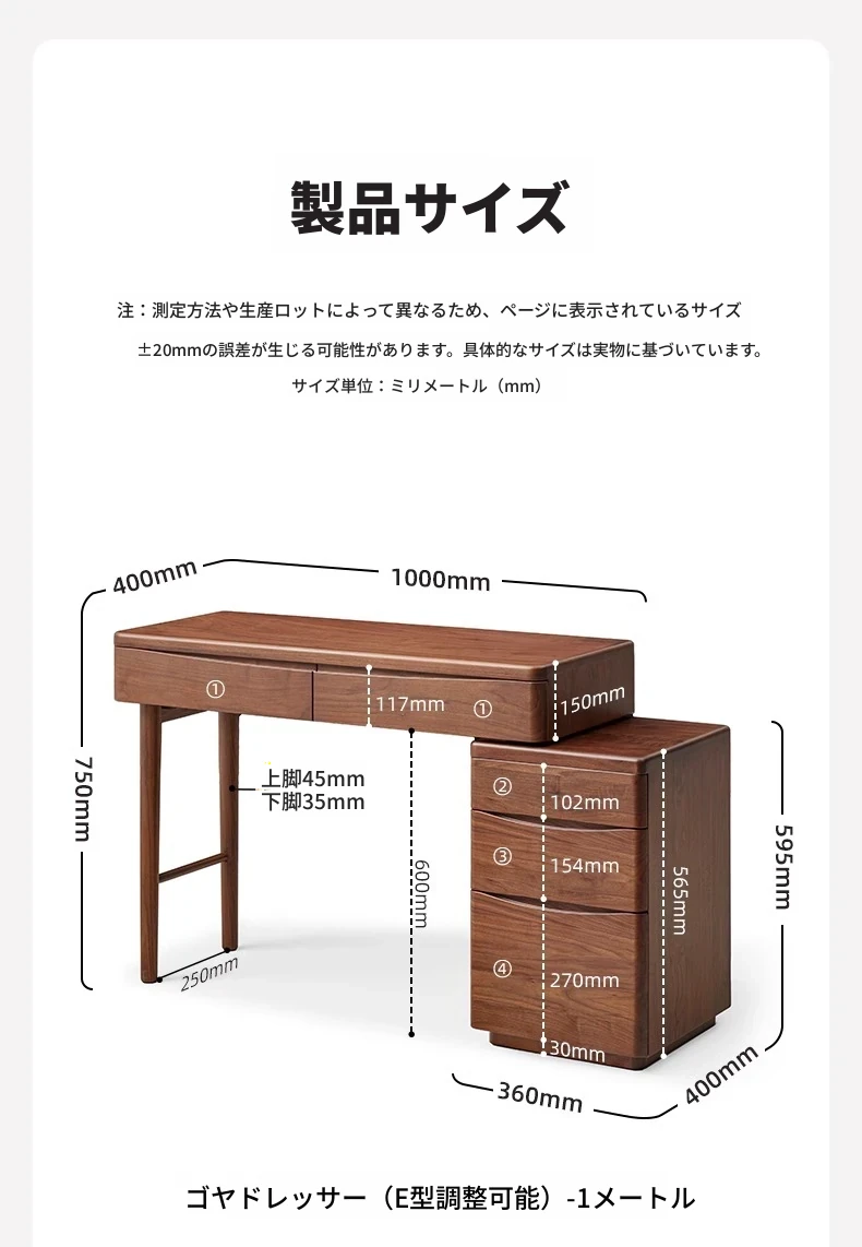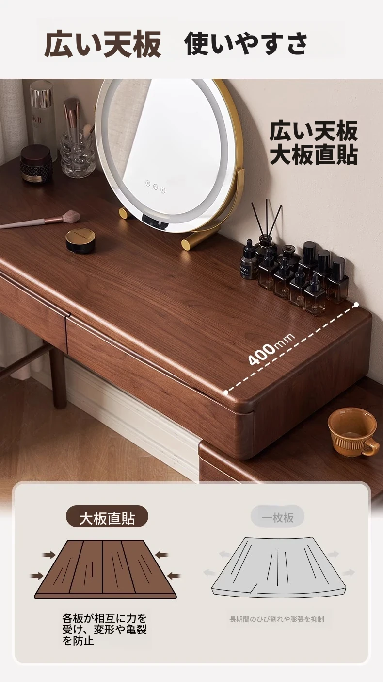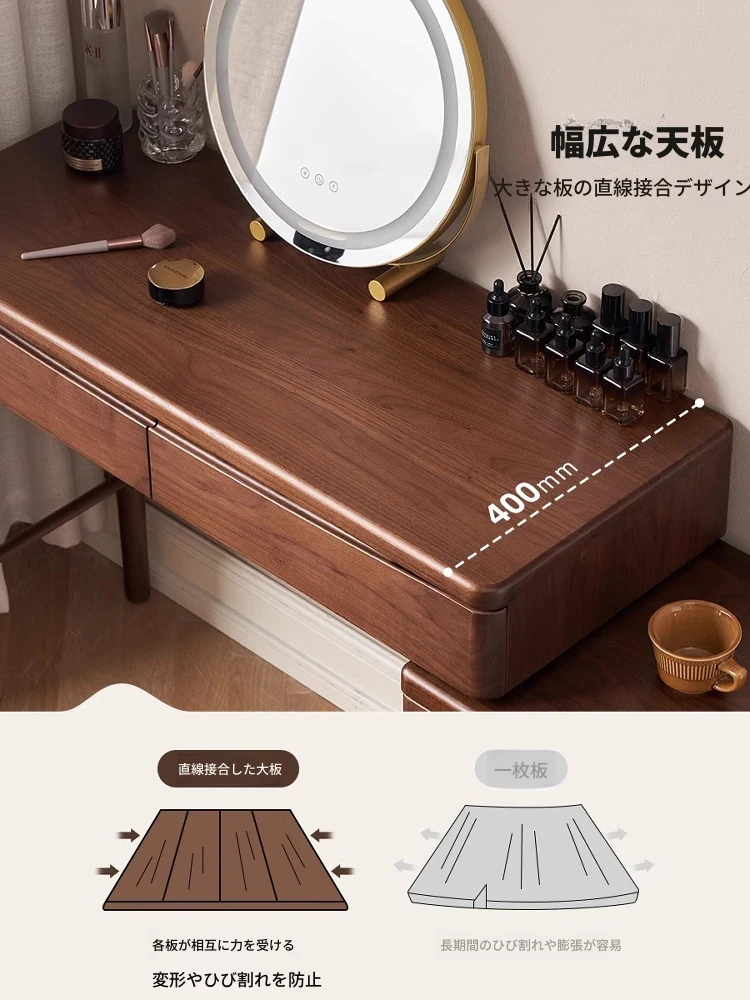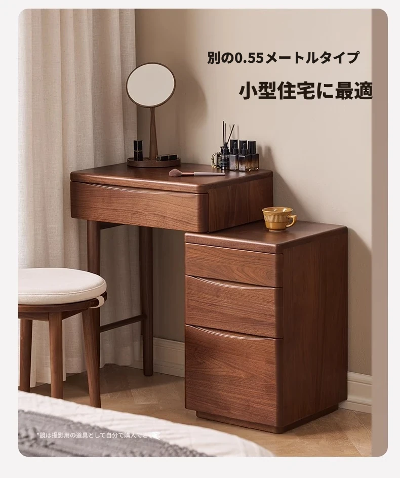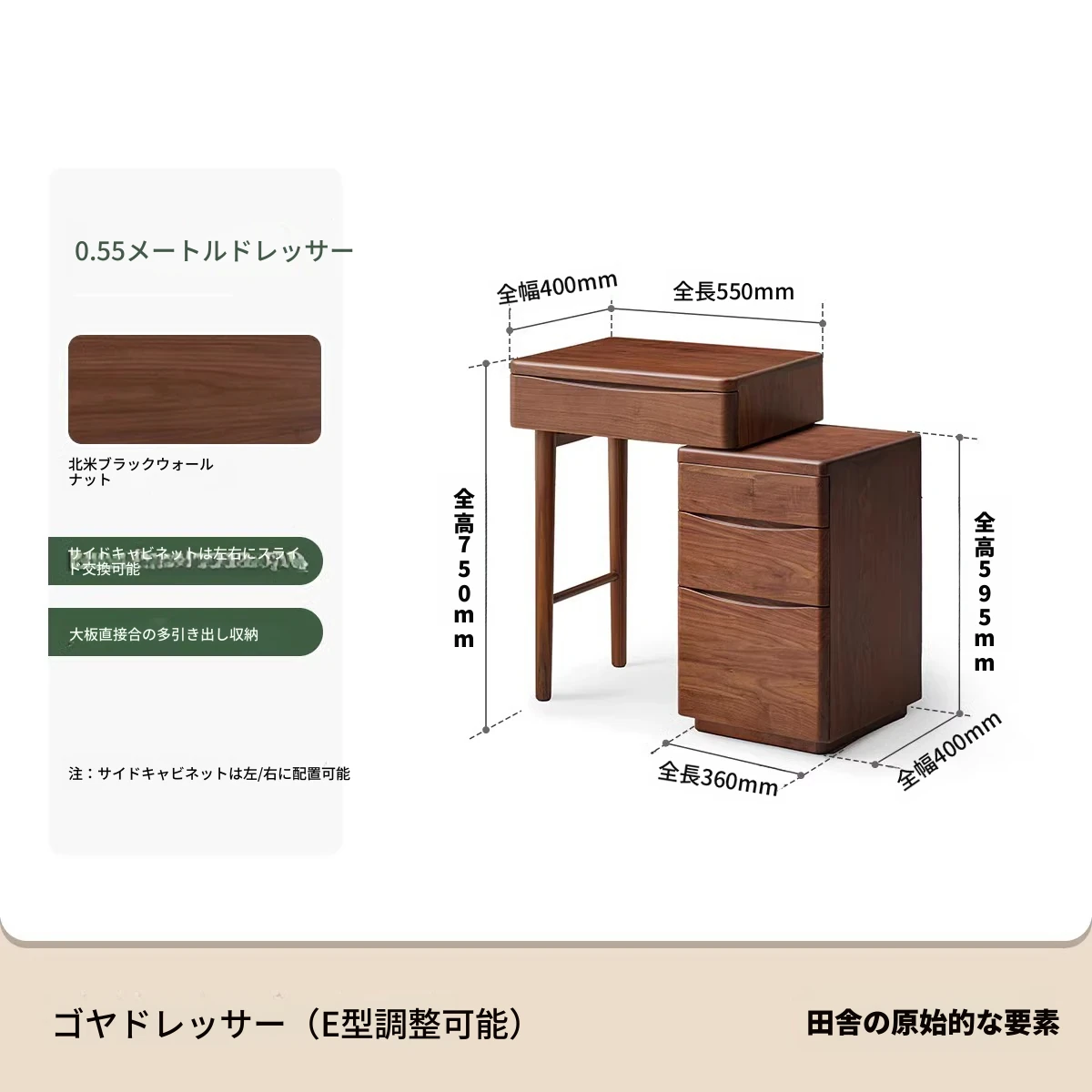 オーセンティックな無垢材のドレッサー - 北美産ブラックウォルナット使用、軽やかなラグジュアリー感!女性のためのメイクアップ&収納一体型テーブルで、あなたの寝室をスタイリッシュに演出します。