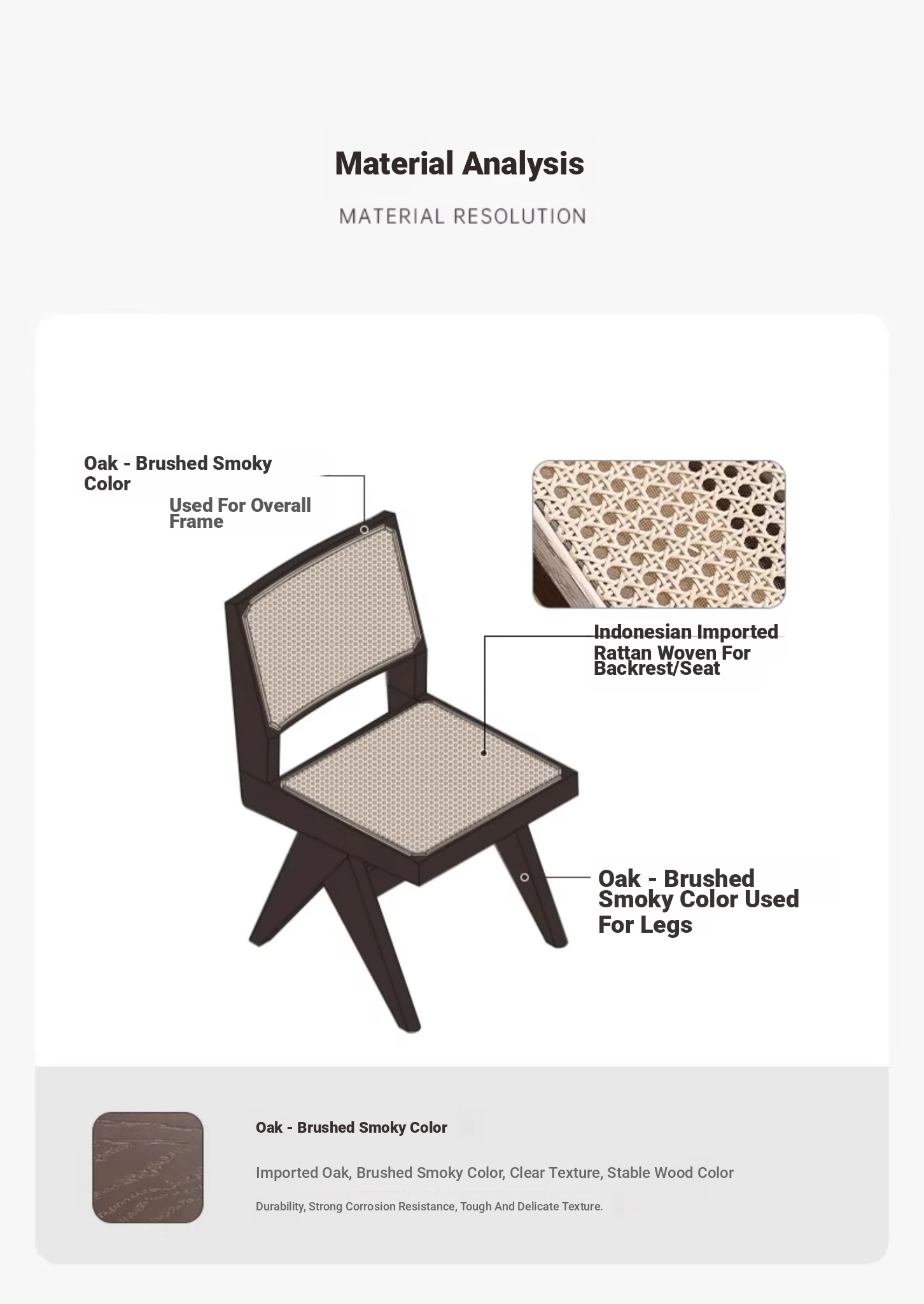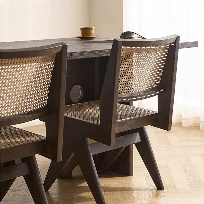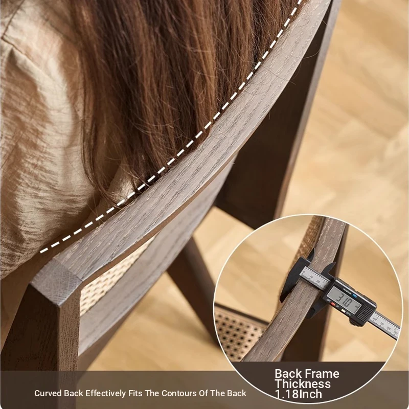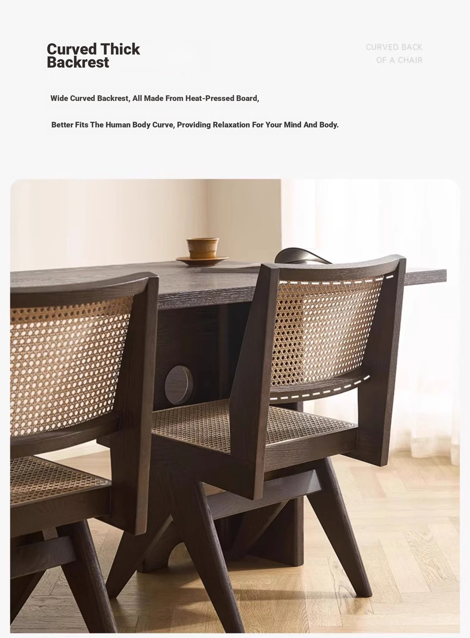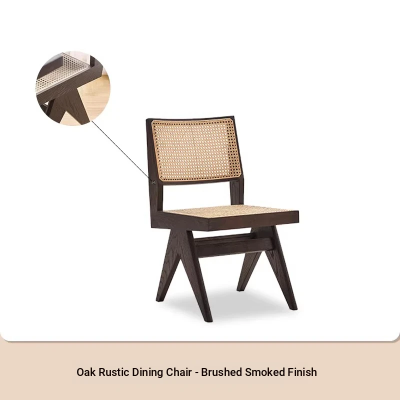 Rustic Solid Wood Dining Chair - Chandigarh Oak Rattan Chair in Wabi-Sabi Style, Smoke Grey Color, Comfortable Leisure Chair with Supportive Backrest. Perfect for Elegant Dining Spaces!