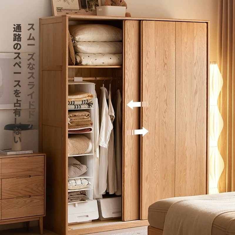 原木素材を使用した全実木製クローゼット - 北欧スタイルのシンプルなデザインで、寝室にぴったり!オーク材のスライドドアで、スタイリッシュかつ機能的な衣類収納を実現。豊富な収納力で、あなたの生活空間を美しく整えます。